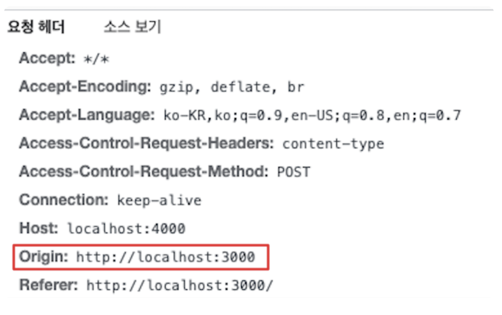 - 기본적으로 브라우저 요청 헤더에 Origin 값을 담아 보낸다.